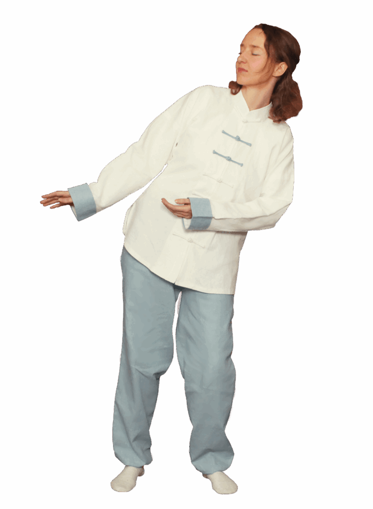 Es handelt sich um eine im Stehen ausgeführte Übung, die die Flexibilität erhöht und mit der Dynamik des mikro-und makrokosmischen Energiekreislaufs kombiniert wird.